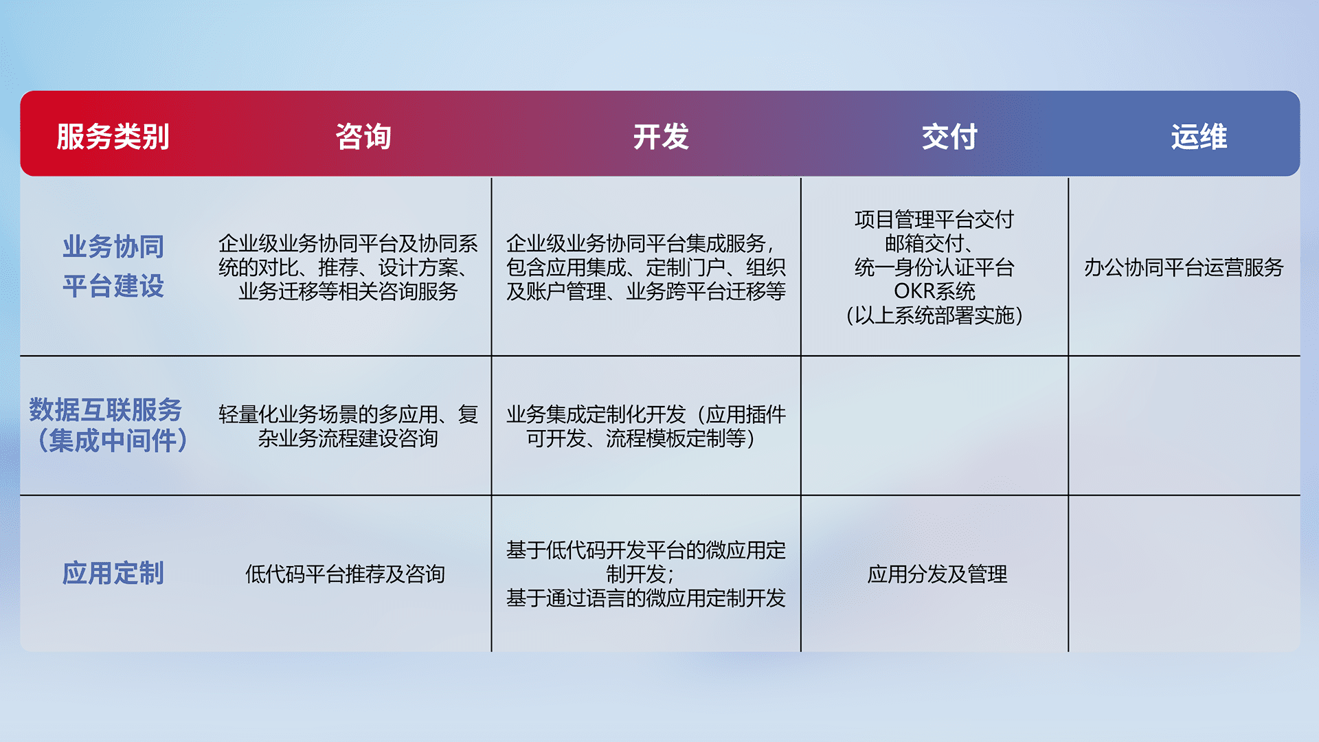 针对钉钉、、、、企微、、、IDaas等平台级产品提供产品的规划、、、方案、、交付、、定制化开发等服务,,实现如统一协同办公、、、、智能客户服务、、、混合会议管理、、智能数据查询、、、、等业务场景,,,实现数字化转型。。。